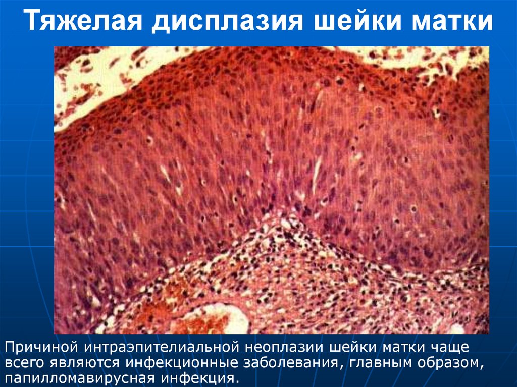 Тяжелая дисплазия шейки маткиПричиной интраэпителиальной неоплазии шейки матки чаще