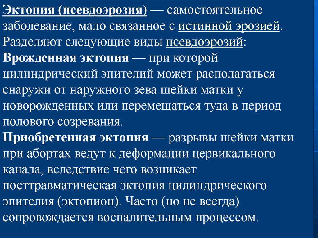 Эктопия (псевдоэрозия) — самостоятельноезаболевание, мало связанное с истинной эрозией.