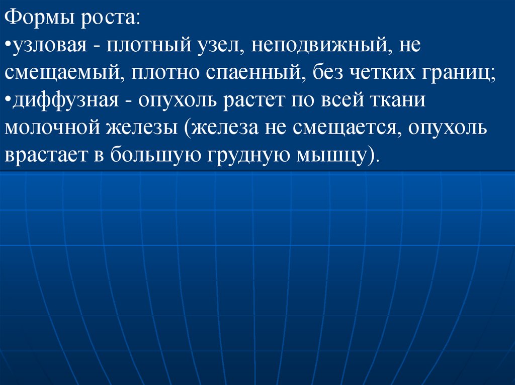 выделяют эндо-, экзофитную, смешанную и язвенноинфильтративную формы роста опухоли, которые во