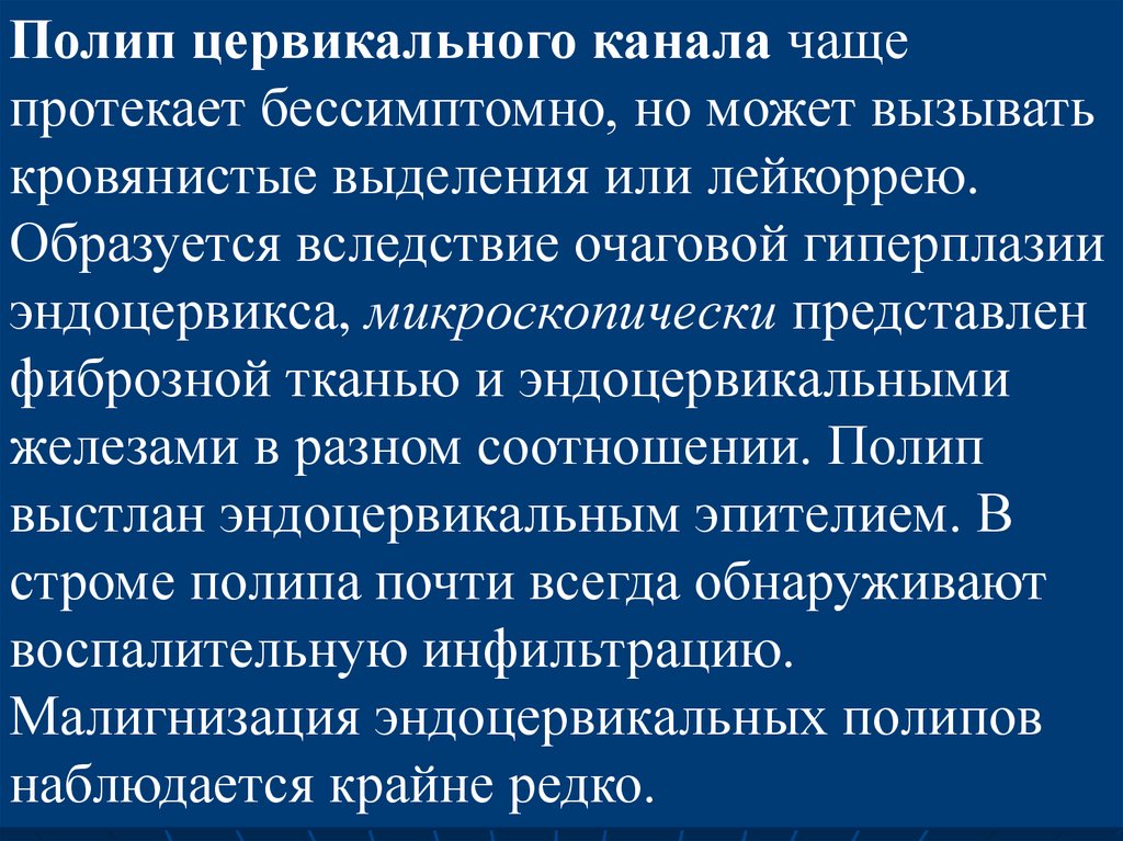 Полип цервикального канала чащепротекает бессимптомно, но может вызывать