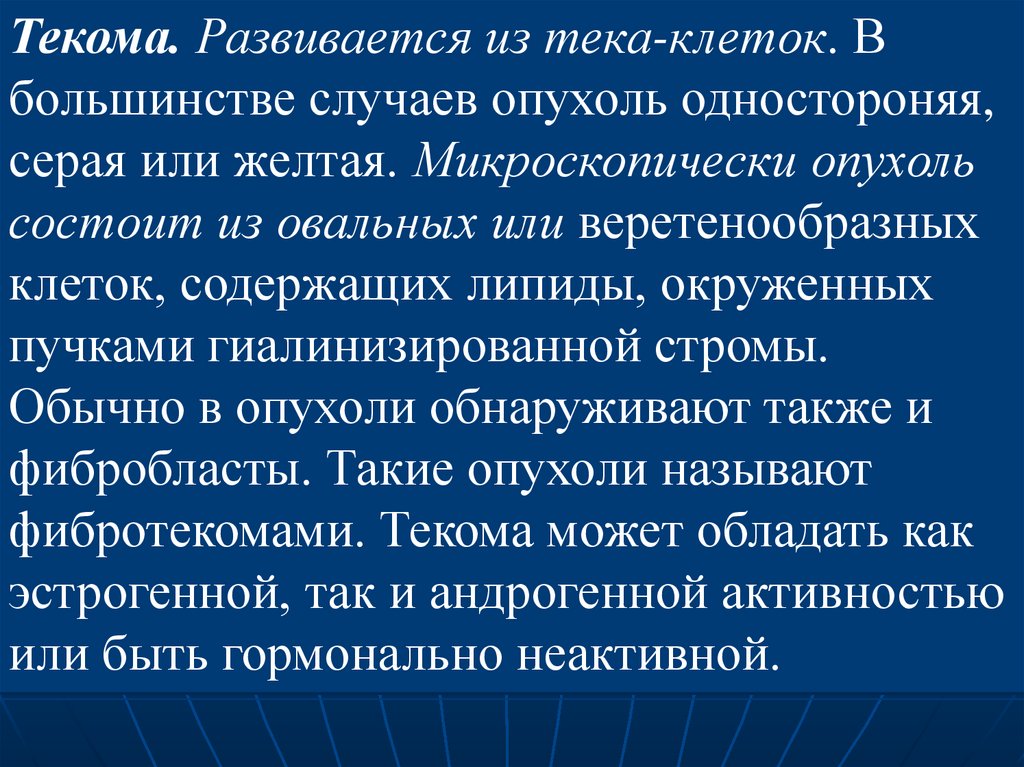 Текома. Развивается из тека-клеток. Вбольшинстве случаев опухоль одностороняя,