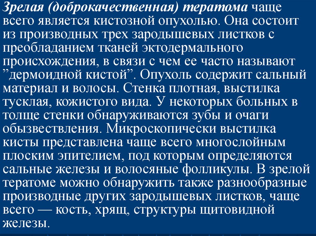 Зрелая (доброкачественная) тератома чащевсего является кистозной опухолью. Она состоит