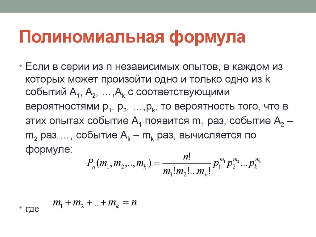 Полиномиальная формула• Если в серии из n независимых опытов, в каждом из
