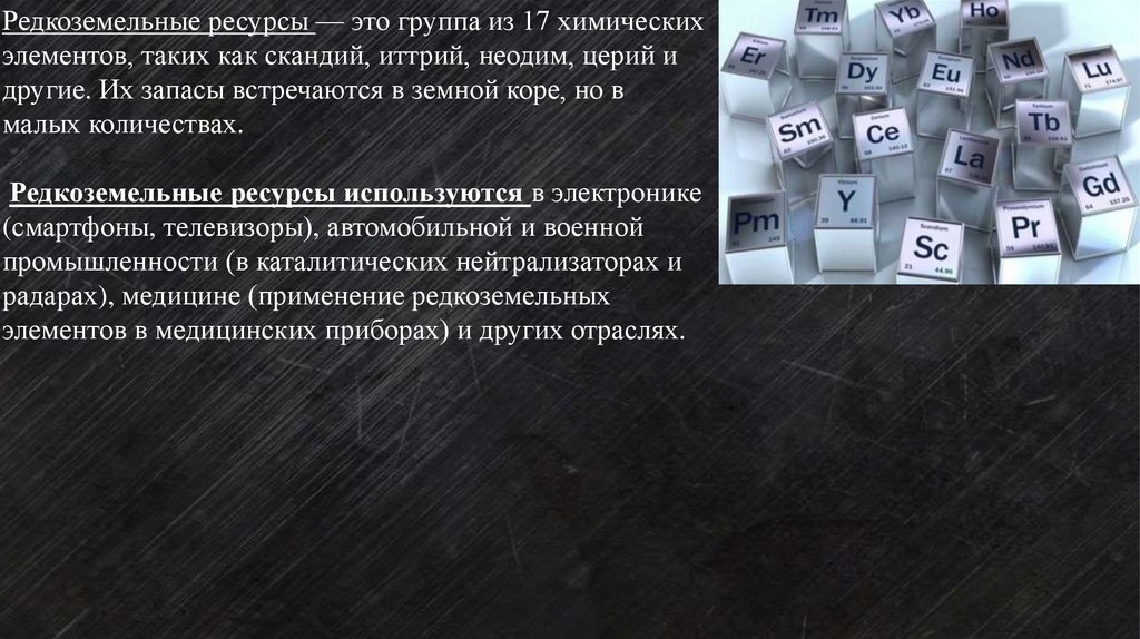 Редкоземельные ресурсы — это группа из 17 химическихэлементов, таких как скандий, иттрий, неодим, церий и