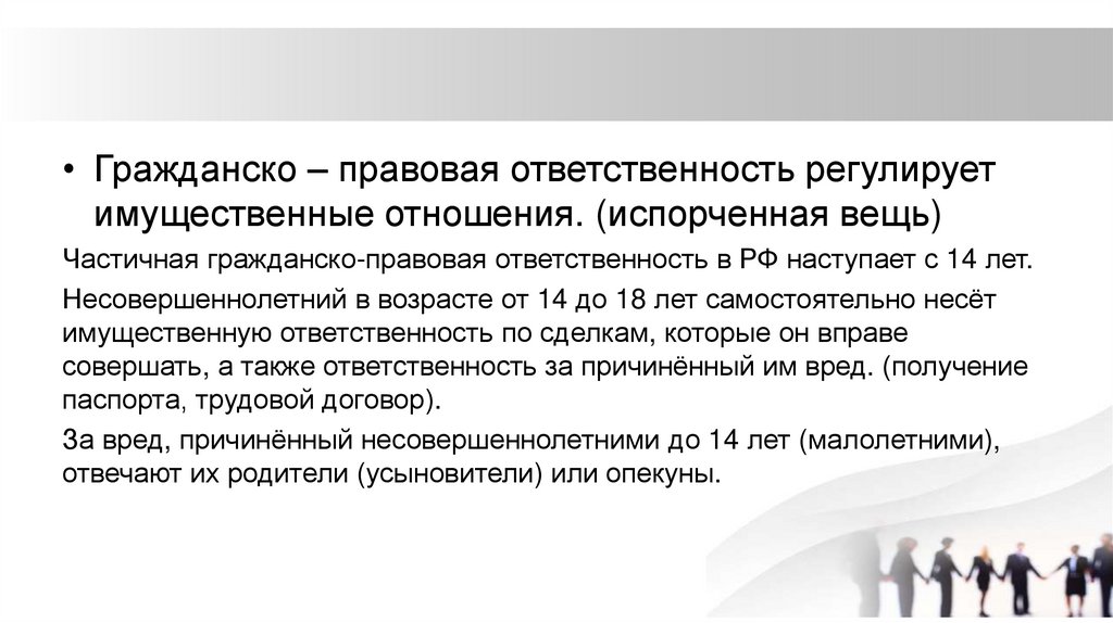 • Гражданско – правовая ответственность регулируетимущественные отношения. (испорченная вещь)