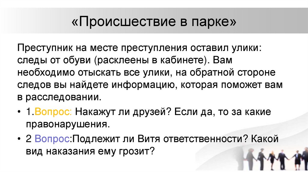 «Происшествие в парке»Преступник на месте преступления оставил улики: