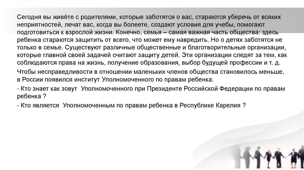 Сегодня вы живёте с родителями, которые заботятся о вас, стараются уберечь от всякихнеприятностей, лечат вас, когда вы болеете, создают условия для учебы, помогают