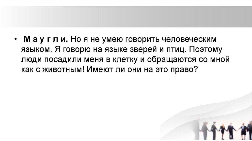 • М а у г л и. Но я не умею говорить человеческимязыком. Я говорю на языке зверей и птиц. Поэтому