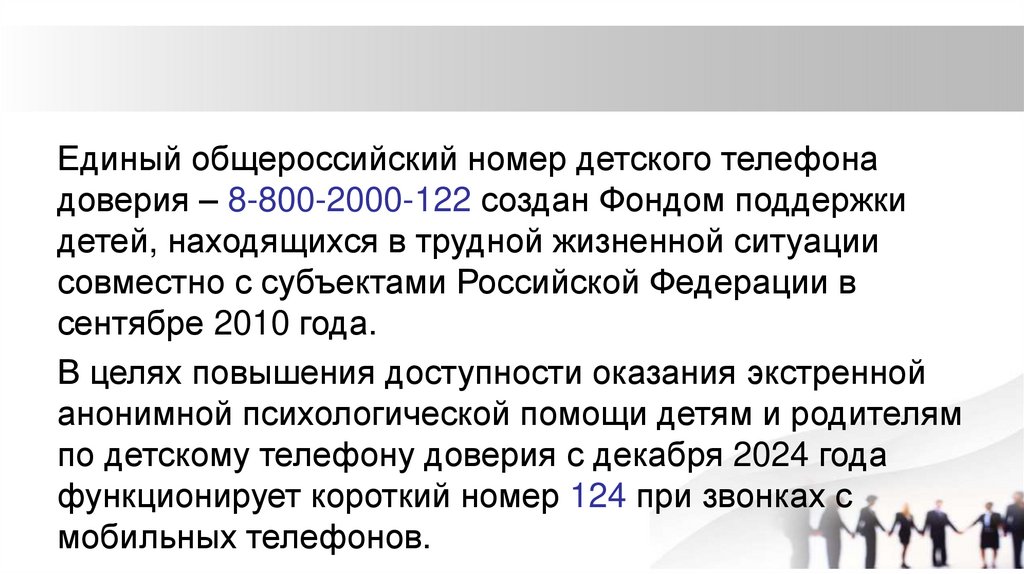 Единый общероссийский номер детского телефонадоверия – 8-800-2000-122 создан Фондом поддержки