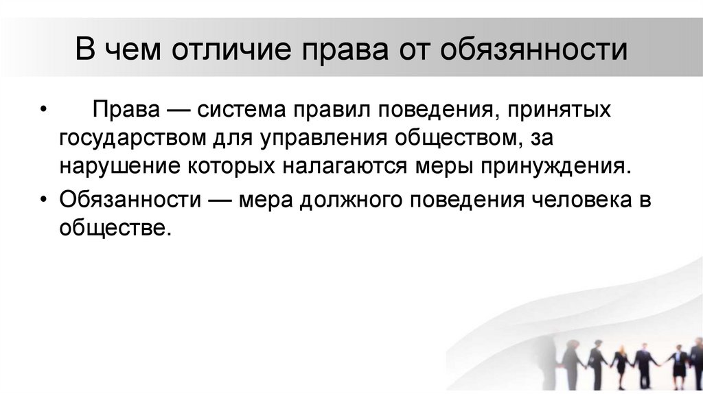 В чем отличие права от обязянностиПрава — система правил поведения, принятых