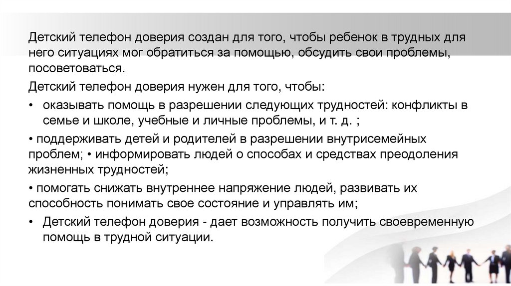 Детский телефон доверия создан для того, чтобы ребенок в трудных длянего ситуациях мог обратиться за помощью, обсудить свои проблемы,
