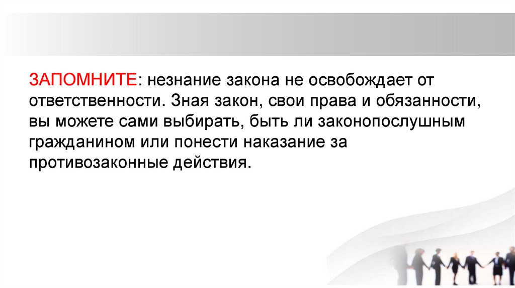 ЗАПОМНИТЕ: незнание закона не освобождает отответственности. Зная закон, свои права и обязанности,