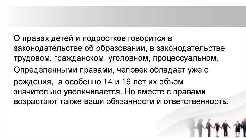 О правах детей и подростков говорится взаконодательстве об образовании, в законодательстве