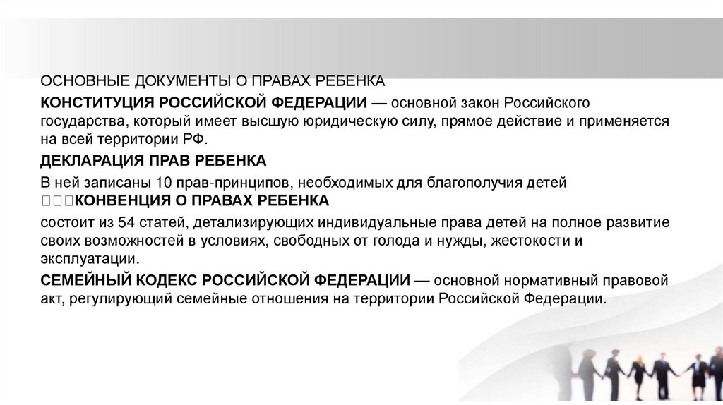 ОСНОВНЫЕ ДОКУМЕНТЫ О ПРАВАХ РЕБЕНКАКОНСТИТУЦИЯ РОССИЙСКОЙ ФЕДЕРАЦИИ — основной закон Российского