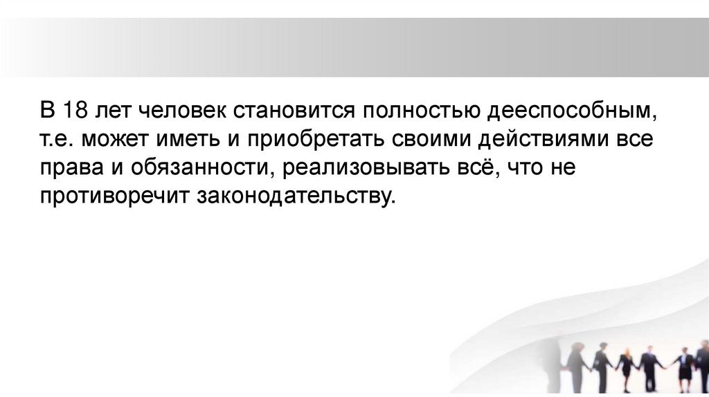 В 18 лет человек становится полностью дееспособным,т.е. может иметь и приобретать своими действиями все