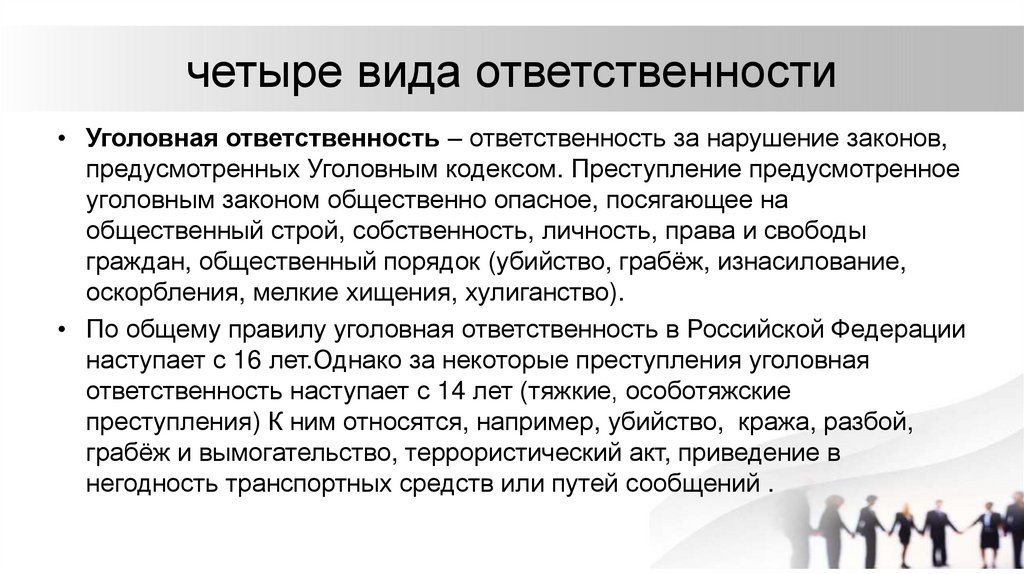 четыре вида ответственности• Уголовная ответственность – ответственность за нарушение законов,
