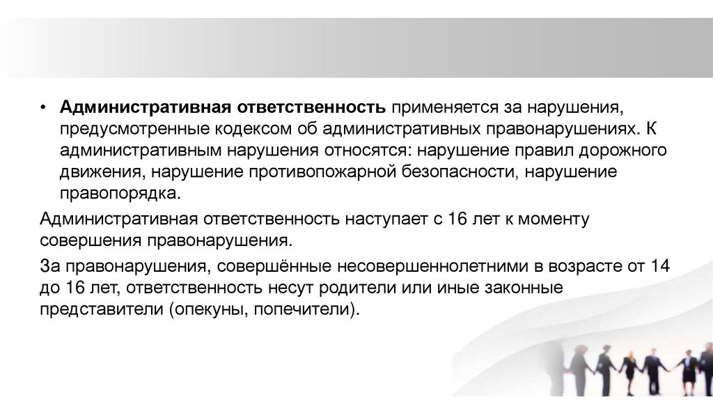 • Административная ответственность применяется за нарушения,предусмотренные кодексом об административных правонарушениях. К