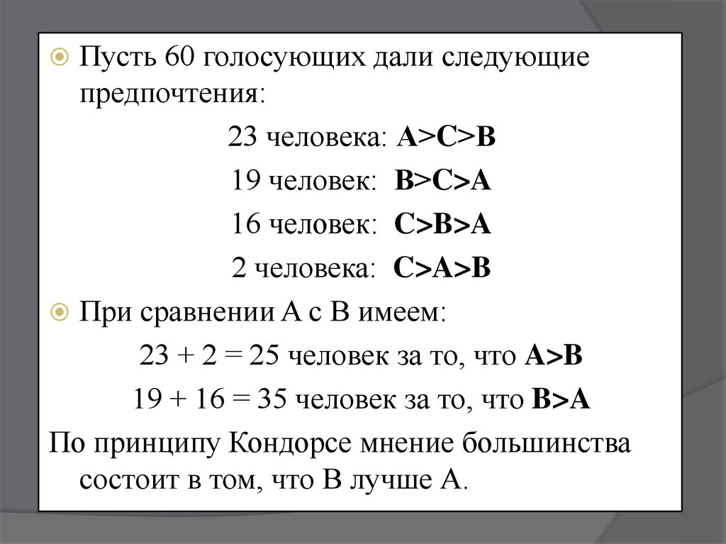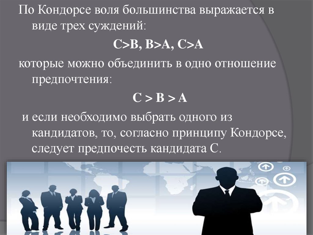 Согласно принципу Кондорсе, для определенияистинной воли большинства необходимо, чтобы