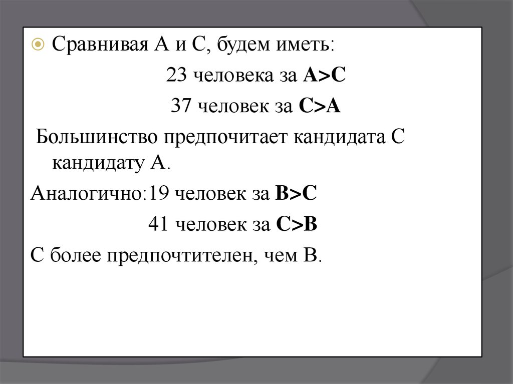 Сравнивая А и С, будем иметь:23 человека за A>C