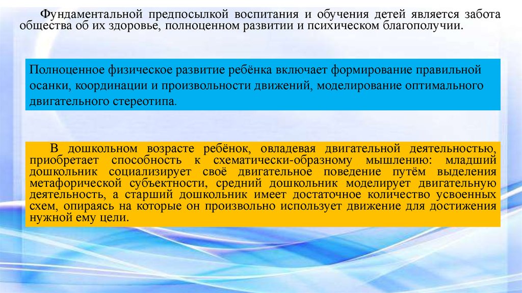 Фундаментальной предпосылкой воспитания и обучения детей является заботаобщества об их здоровье, полноценном развитии и психическом благополучии.