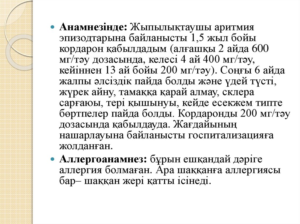 Анамнезінде: Жыпылықтаушы аритмияэпизодтарына байланысты 1,5 жыл бойы