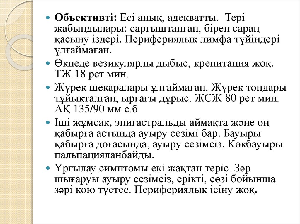 Объективті: Есі анық, адекватты. Теріжабындылары: сарғыштанған, бірен сараң