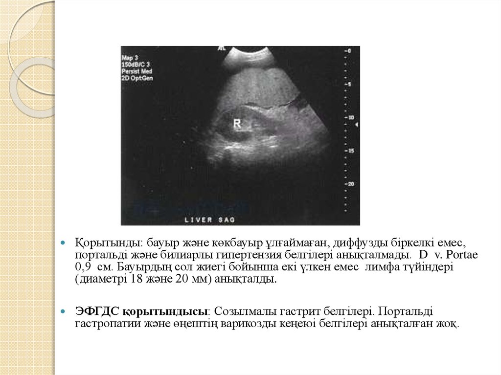 Қорытынды: бауыр және көкбауыр ұлғаймаған, диффузды біркелкі емес,портальді және билиарлы гипертензия белгілері анықталмады. D v. Portae