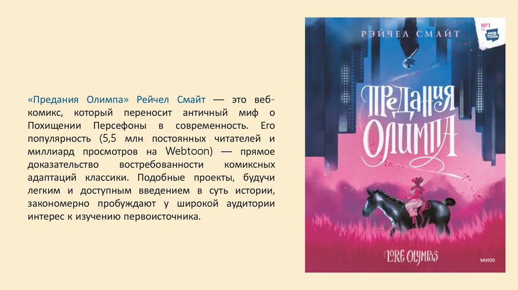 «Предания Олимпа» Рейчел Смайт — это вебкомикс, который переносит античный миф оПохищении Персефоны в современность. Его