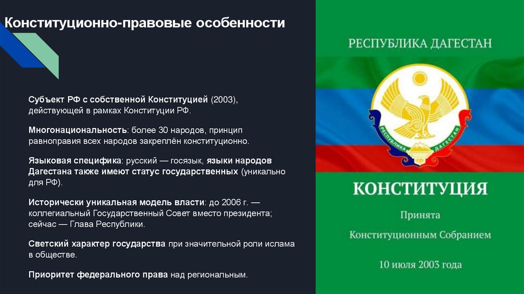 Конституционно-правовые особенностиСубъект РФ с собственной Конституцией (2003),