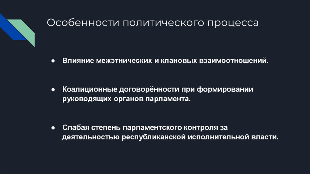 Особенности политического процесса● Влияние межэтнических и клановых взаимоотношений.