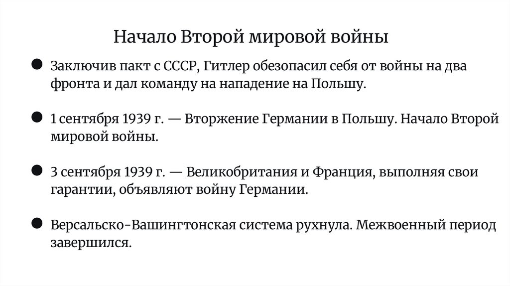 Начало Второй мировой войны● Заключив пакт с СССР, Гитлер обезопасил себя от войны на два