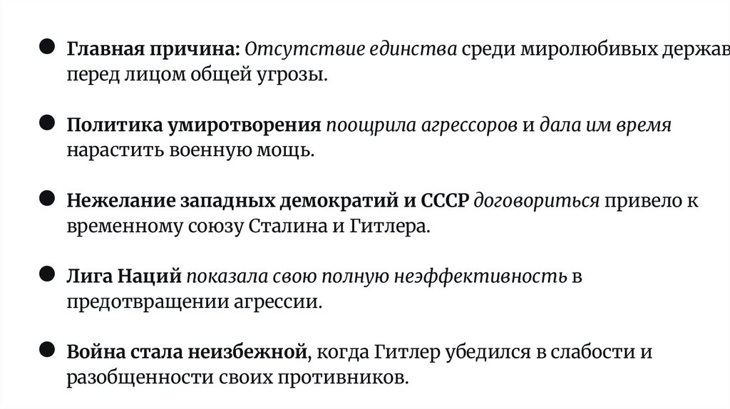 ● Главная причина: Отсутствие единства среди миролюбивых державперед лицом общей угрозы.