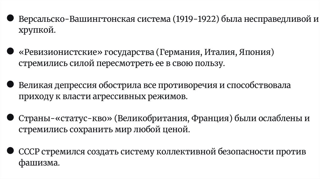 ● Версальско-Вашингтонская система (1919-1922) была несправедливой ихрупкой.