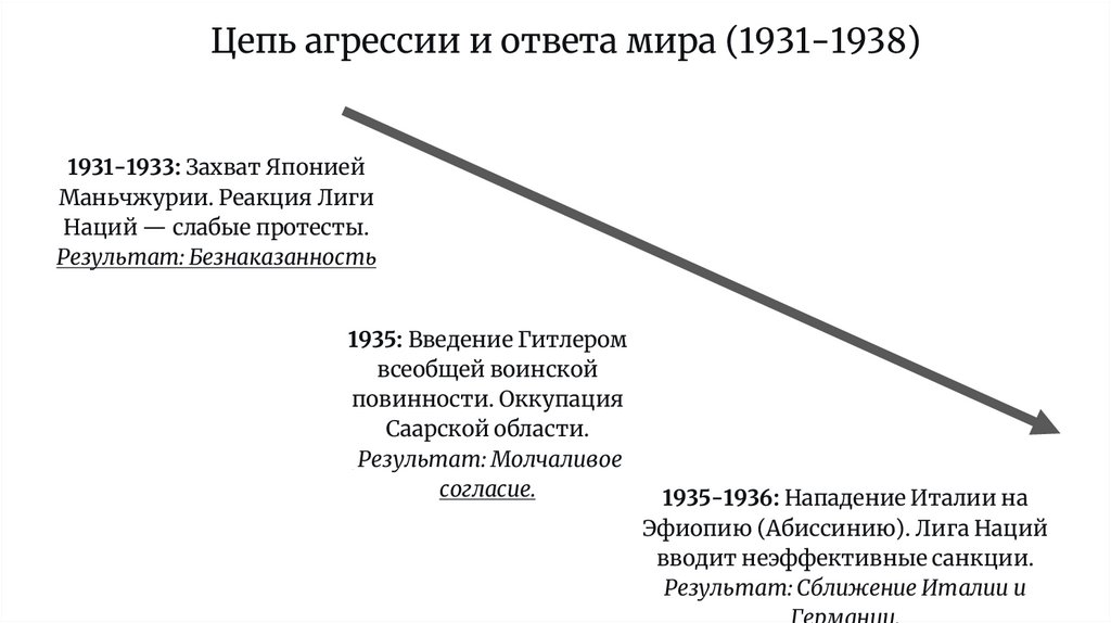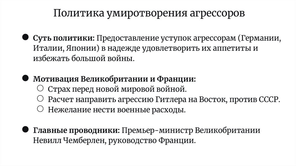 Политика умиротворения агрессоров● Суть политики: Предоставление уступок агрессорам (Германии,