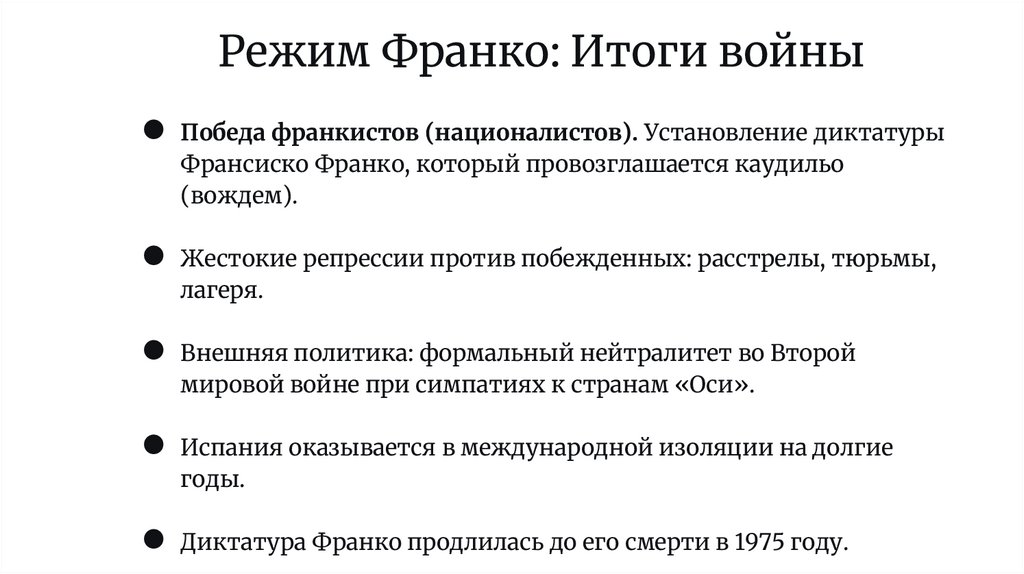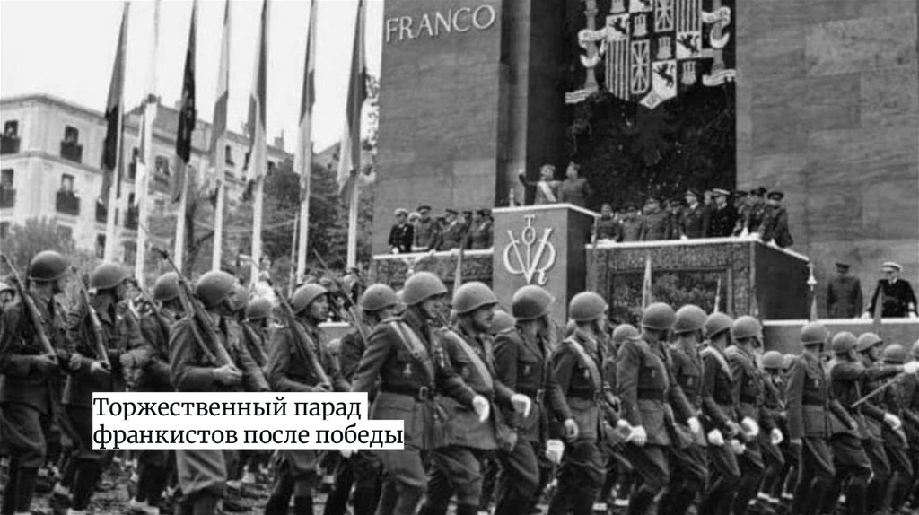 Режим Франко: Итоги войны● Победа франкистов (националистов). Установление диктатуры