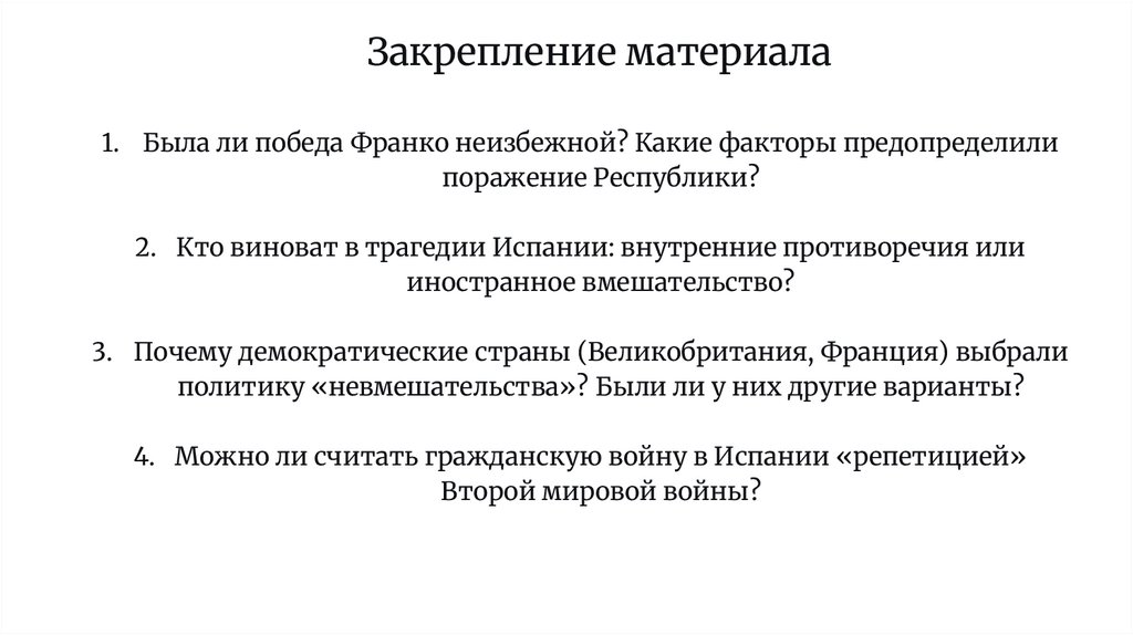 Закрепление материала1. Была ли победа Франко неизбежной? Какие факторы предопределили