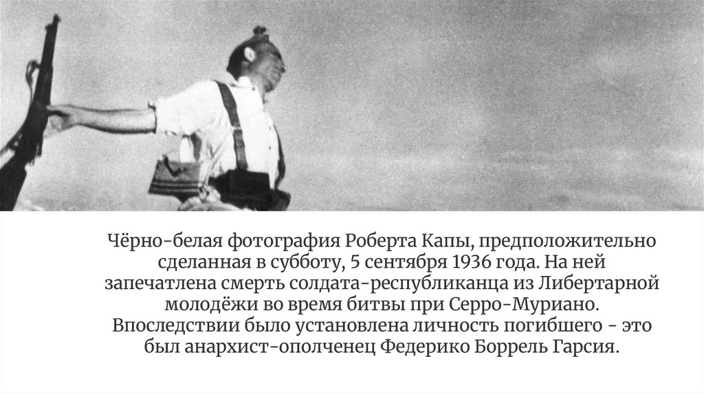 Чёрно-белая фотография Роберта Капы, предположительносделанная в субботу, 5 сентября 1936 года. На ней