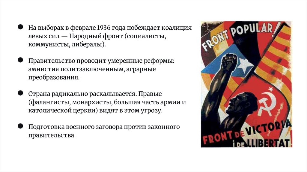 ● На выборах в феврале 1936 года побеждает коалициялевых сил — Народный фронт (социалисты,