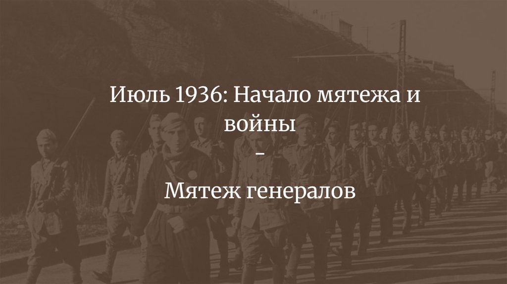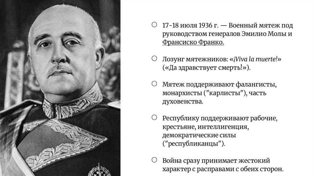 ○ 17-18 июля 1936 г. — Военный мятеж подруководством генералов Эмилио Молы и