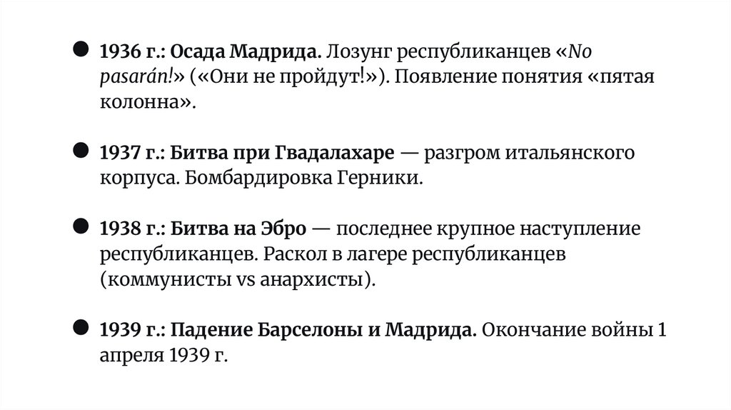 ● 1936 г.: Осада Мадрида. Лозунг республиканцев «Nopasarán!» («Они не пройдут!»). Появление понятия «пятая