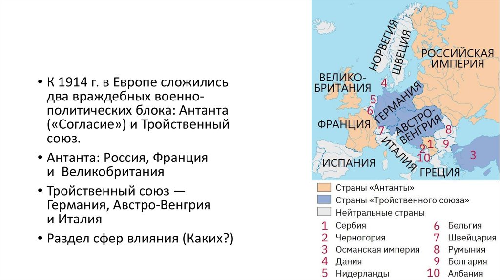 • Домашнее задание: пересказ п.1 + выписать на какие сферывлияния рассчитывали Антанта и Тройственный союз