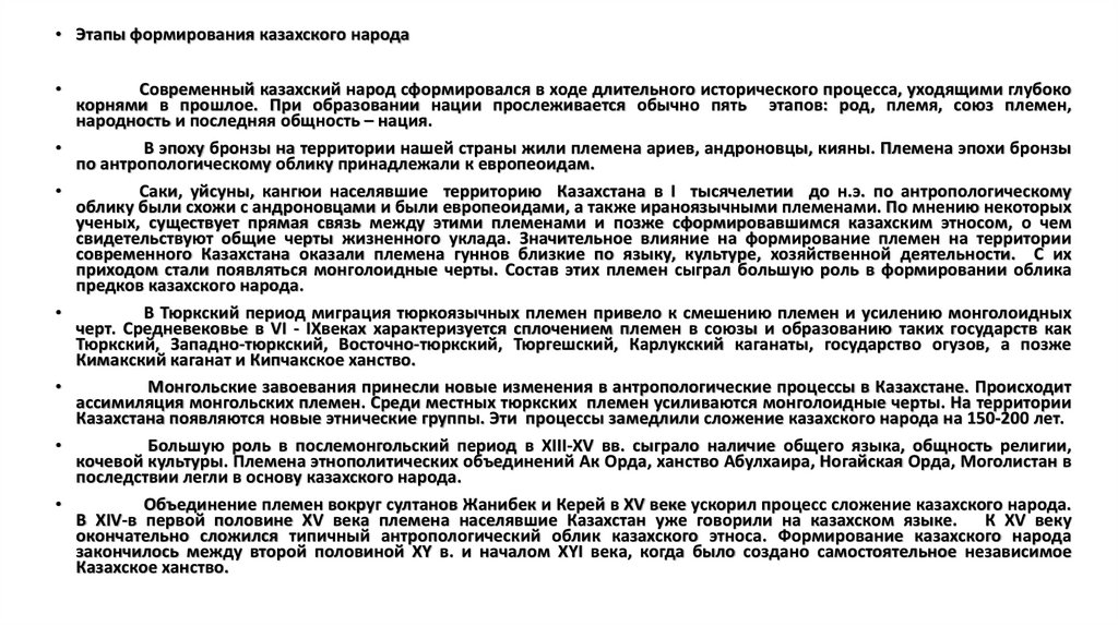 • Этапы формирования казахского народаСовременный казахский народ сформировался в ходе длительного исторического процесса, уходящими глубоко