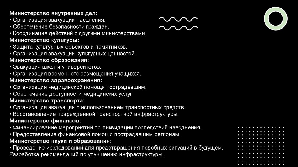 • Организация медицинской помощи пострадавшим.Министерство внутренних дел: