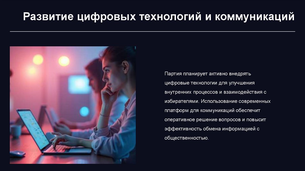 Развитие цифровых технологий и коммуникацийПартия планирует активно внедрять