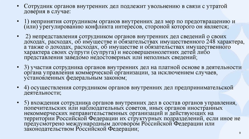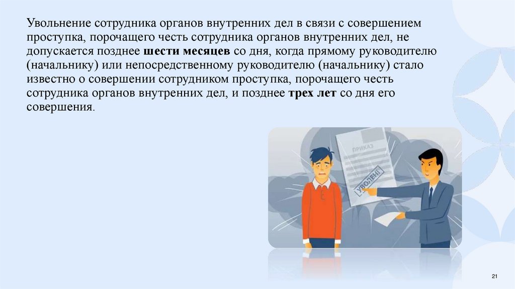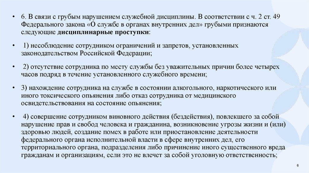 • 6. В связи с грубым нарушением служебной дисциплины. В соответствии с ч. 2 ст. 49Федерального закона «О службе в органах внутренних дел» грубыми признаются