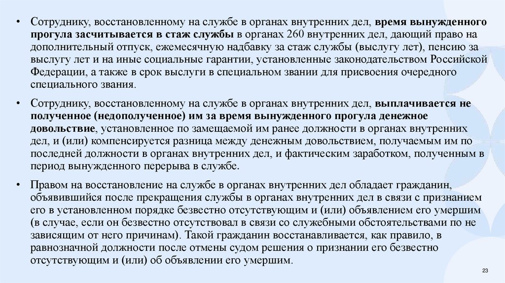 • Сотруднику, восстановленному на службе в органах внутренних дел, время вынужденногопрогула засчитывается в стаж службы в органах 260 внутренних дел, дающий право на