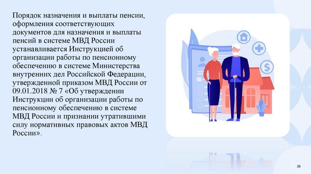 10. Приказ МВД России от 09.01.2018 № 7 «Об утверждении Инструкции об организации работы по пенсионному обеспечению в