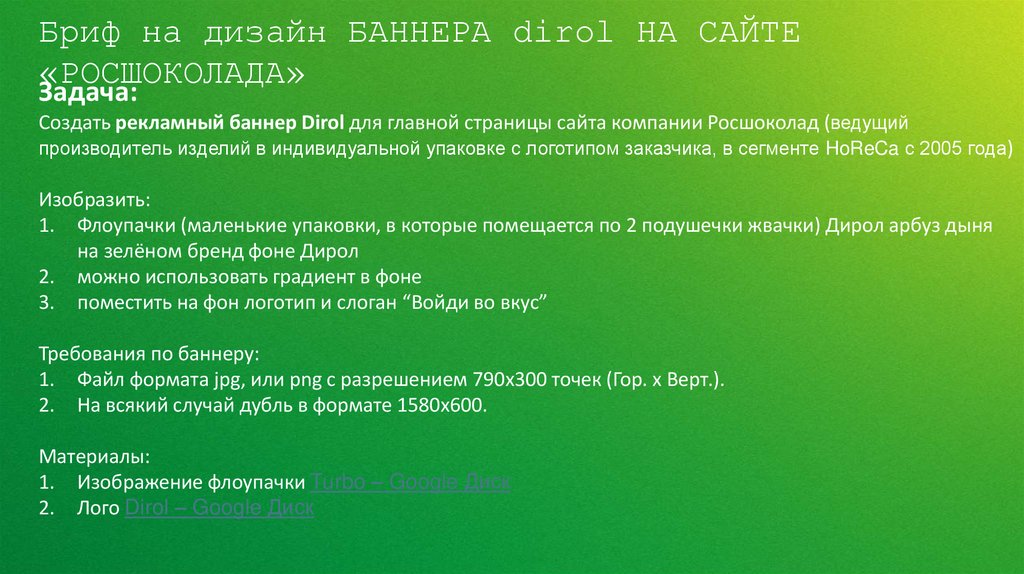 Бриф на дизайн БАННЕРА dirol НА САЙТЕ«РОСШОКОЛАДА»
