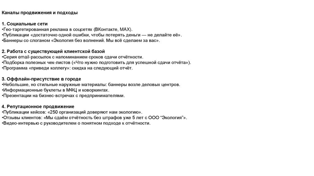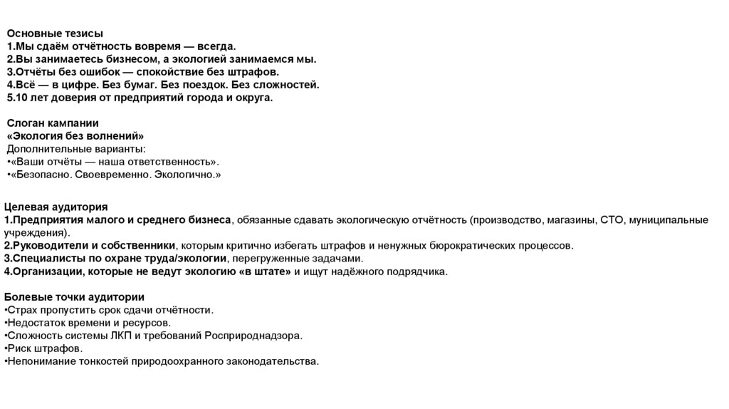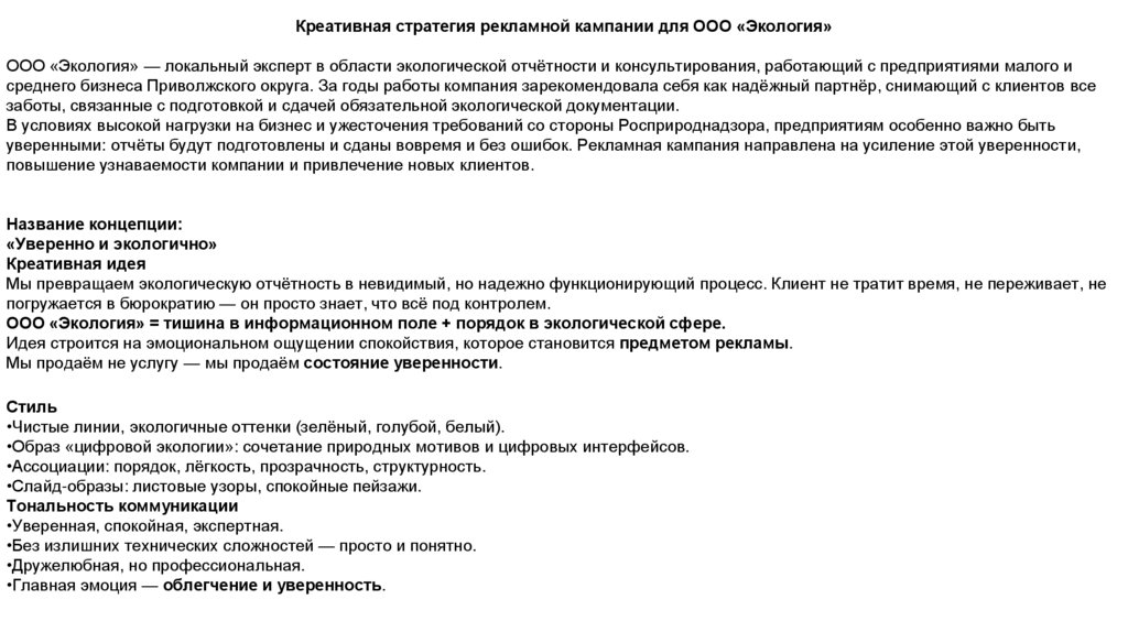 Креативная стратегия рекламной кампании для ООО «Экология»ООО «Экология» — локальный эксперт в области экологической отчётности и консультирования, работающий с предприятиями малого и