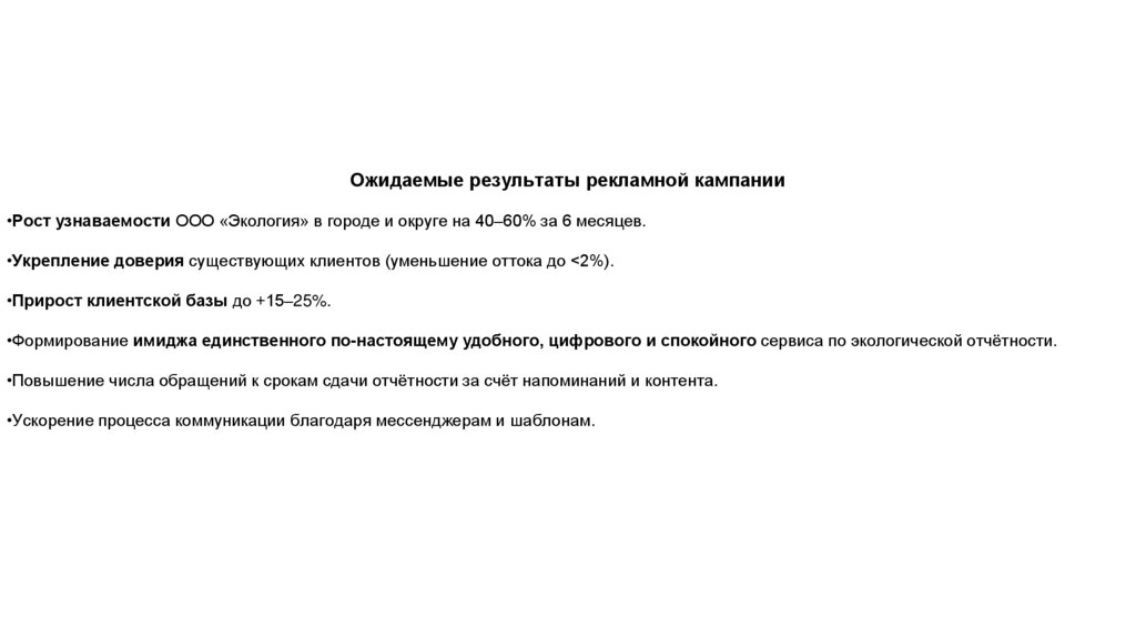 Ожидаемые результаты рекламной кампании•Рост узнаваемости ООО «Экология» в городе и округе на 40–60% за 6 месяцев.